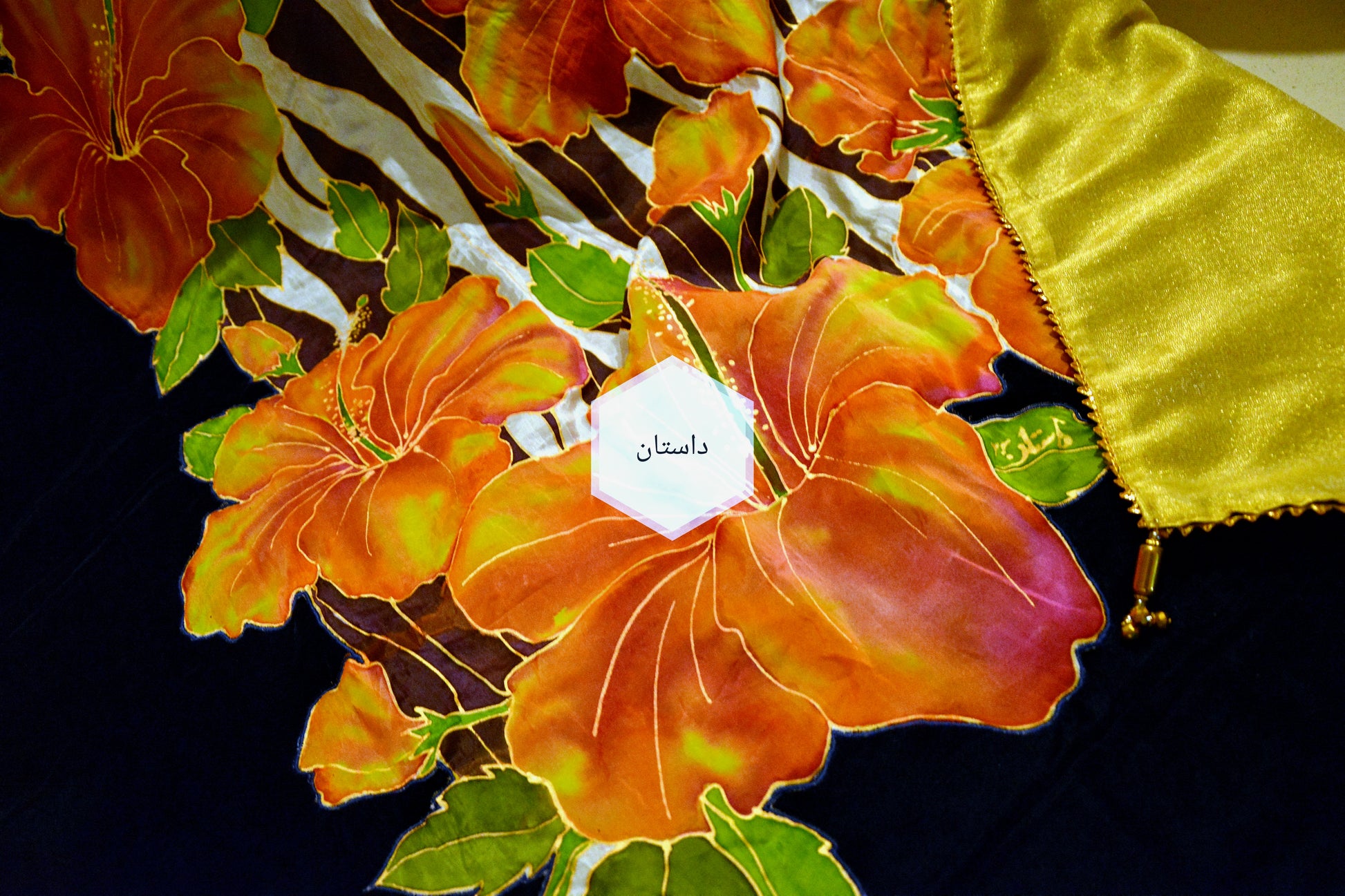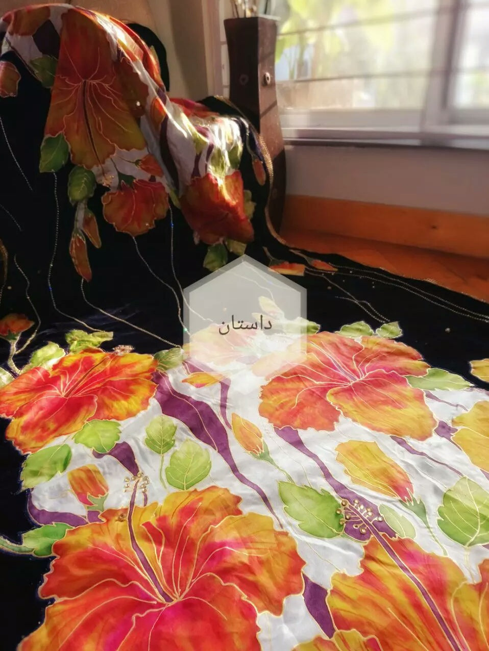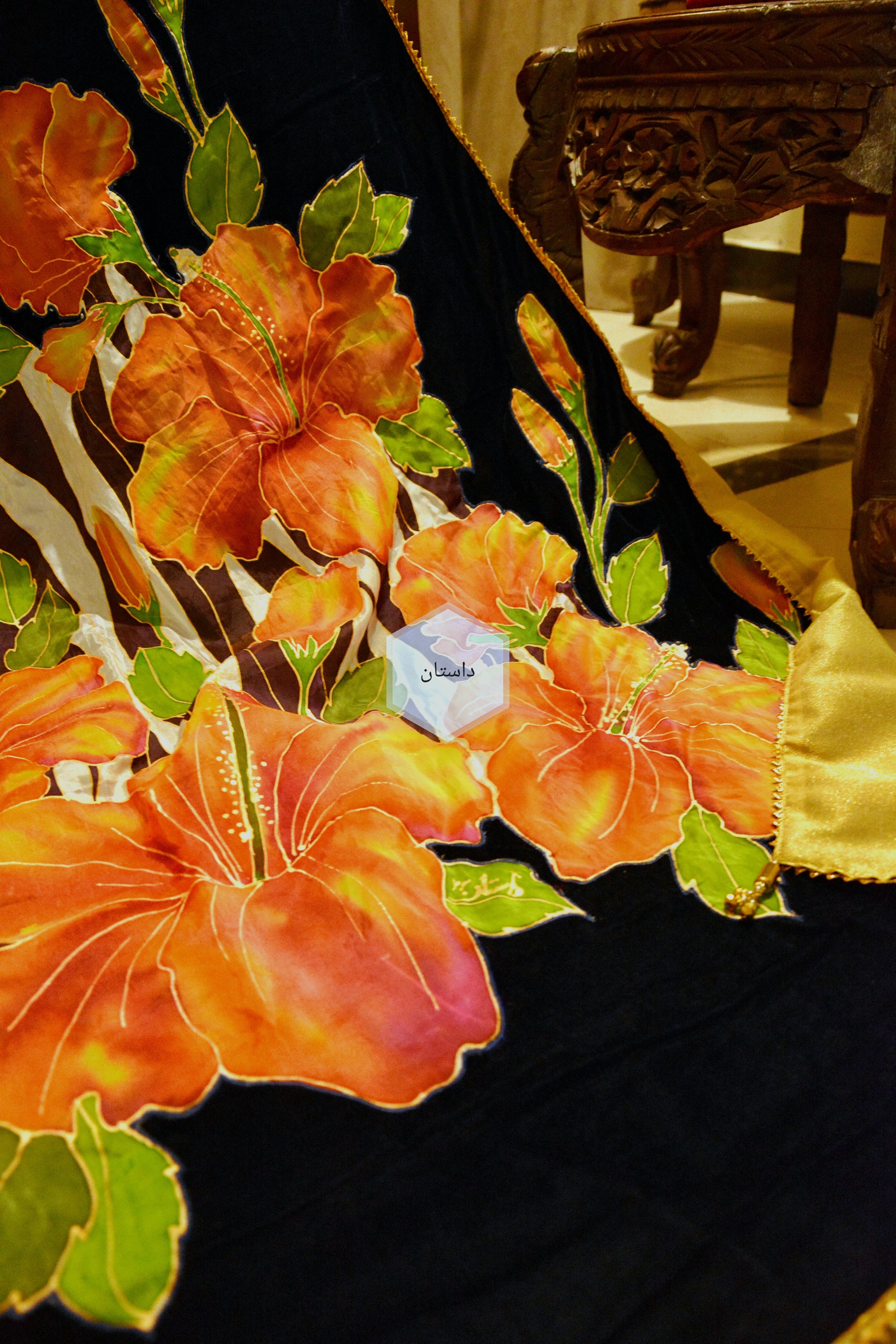 Exquisitely Hand Painted velvet shawl with work of silk and embroidery, golden organza at the back side and lace all around.