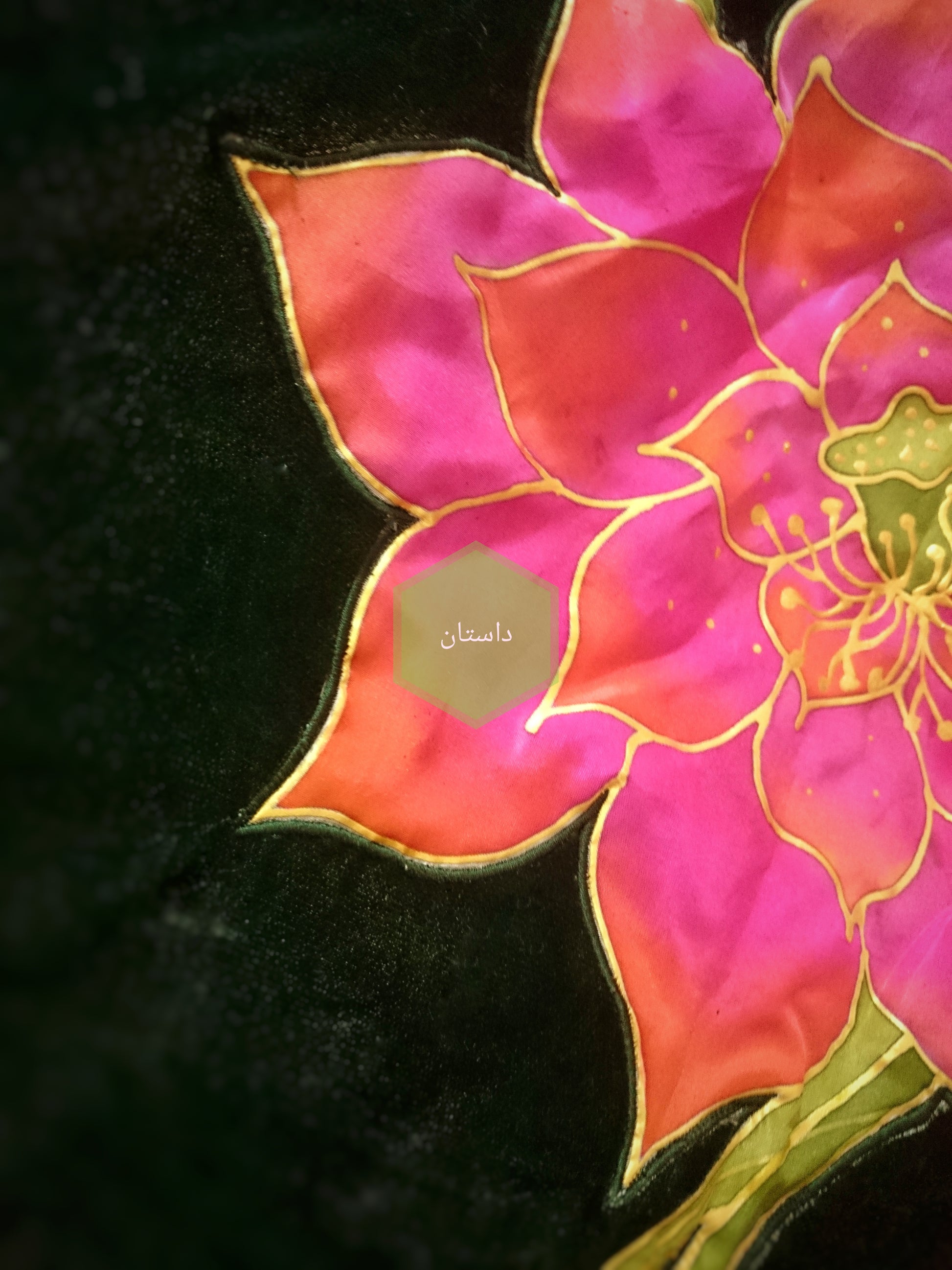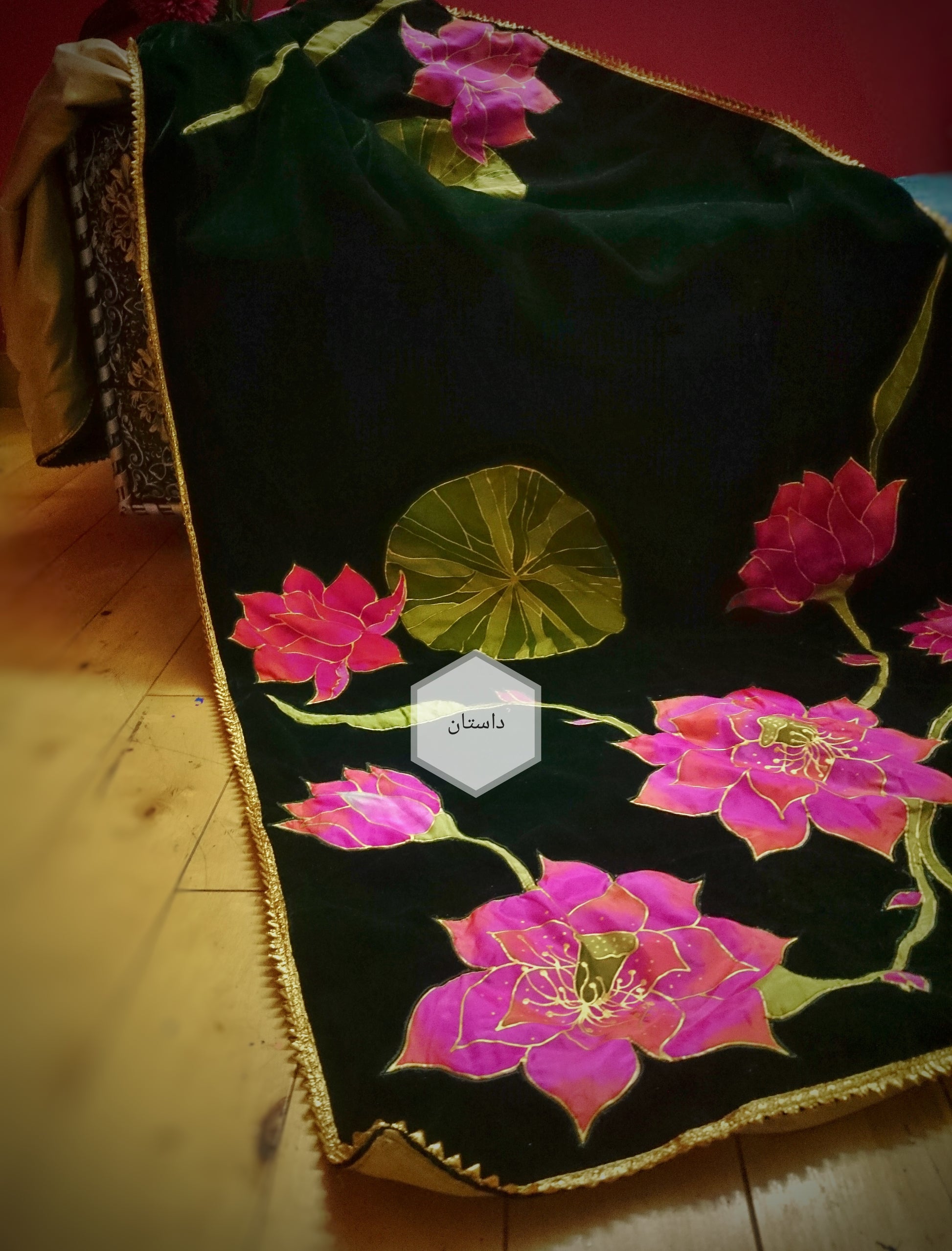 Exquisitely Hand Painted Velvet Shawl with silk and embroidery. Golden organza at the back and lace all four side.