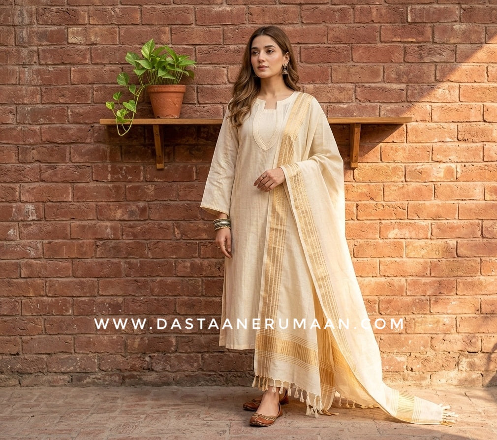 RUMAAN's Beautiful hand woven pure cotton stitched suit. Elevate your style in comfortable ethnic fabric.
