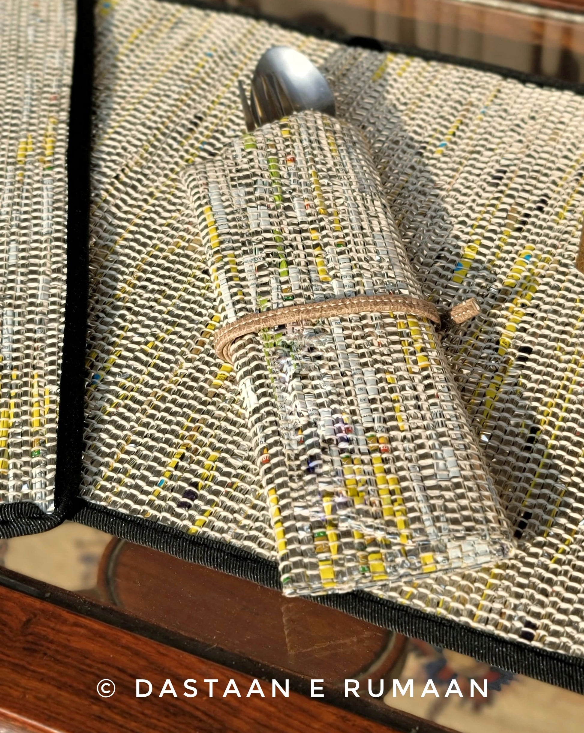 This product is handmade using post-used plastic wrappers and multilayered packaging, collected and transformed through an eco-conscious weaving process. Recycler Rumaan is sustainable project of Dastaan E Rumaan ®, each piece reflects our commitment to sustainability and craftsmanship.